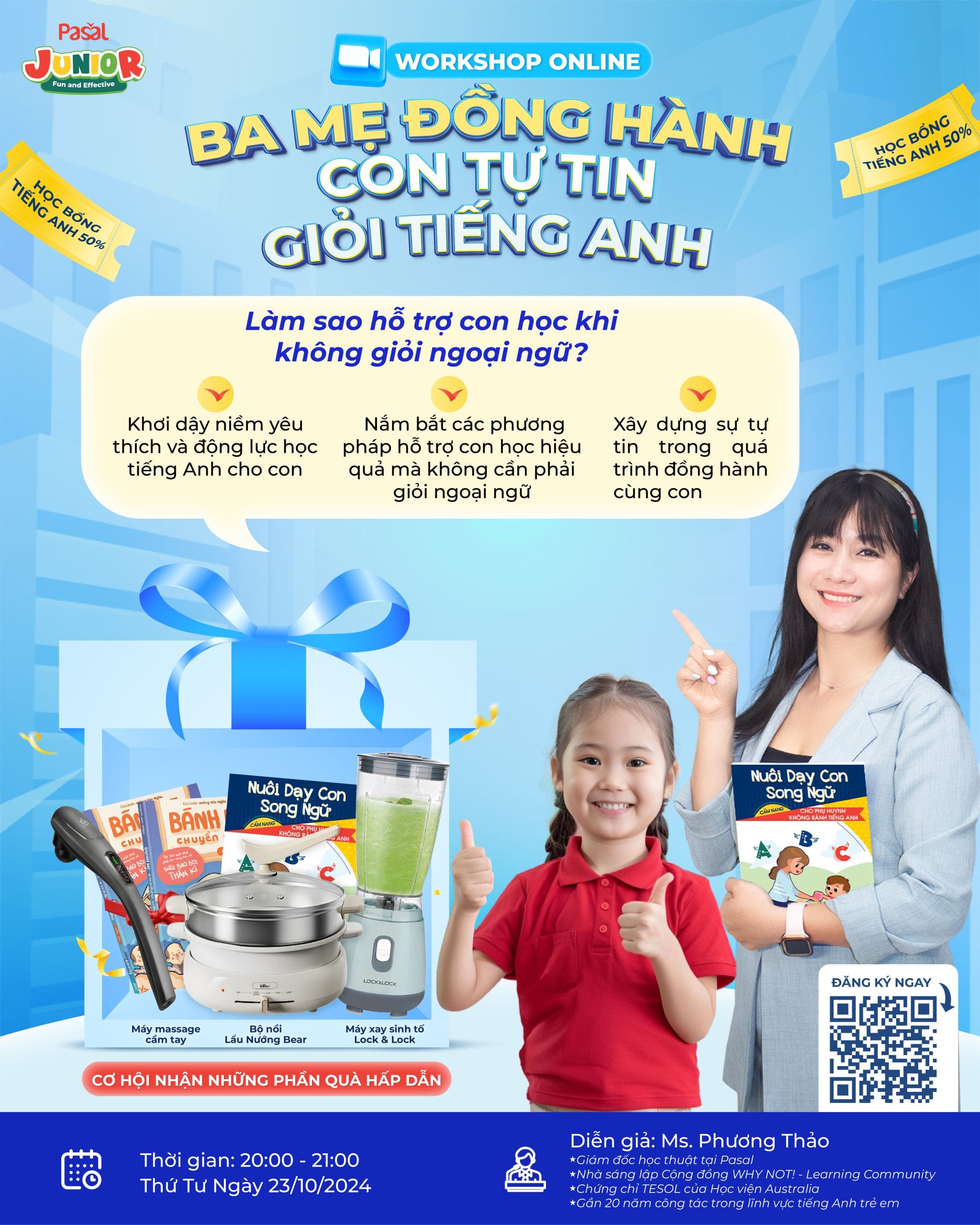 Thấu hiểu vấn đề của ba mẹ, Pasal tổ chức Workshop online với chủ đề “Ba Mẹ Đồng Hành – Con Tự Tin Giỏi Tiếng Anh” nhằm mục đích giúp ba mẹ cách khám phá tạo động lực và niềm yêu thích học tiếng Anh cho con, đồng thời biết được những phương pháp hỗ trợ hiệu quả dù ba mẹ không thành thạo ngoại ngữ.