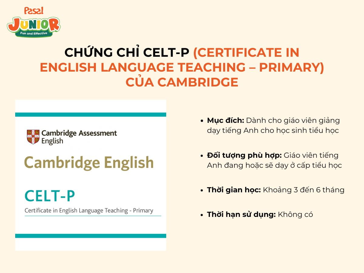 - Mục đích: CELT-P là chứng chỉ của Cambridge English, chuyên dành cho giáo viên giảng dạy tiếng Anh cho học sinh tiểu học (Primary). Chương trình tập trung vào các phương pháp giảng dạy tiếng Anh hiệu quả cho trẻ em ở độ tuổi từ 6 đến 12.
