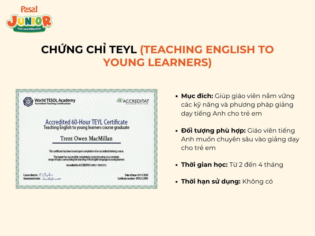 - Mục đích: TEYL là chứng chỉ quốc tế, giúp giáo viên nắm vững các kỹ năng và phương pháp giảng dạy tiếng Anh cho trẻ em. Chứng chỉ này được nhiều tổ chức giáo dục quốc tế công nhận.