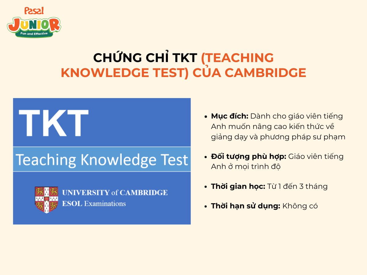 - Mục đích: Chứng chỉ TKT là chứng nhận của Cambridge English, dành cho giáo viên tiếng Anh muốn nâng cao kiến thức về giảng dạy và phương pháp sư phạm. Chứng chỉ này bao gồm nhiều module, trong đó có module chuyên về giảng dạy tiếng Anh cho trẻ em (Young Learners).