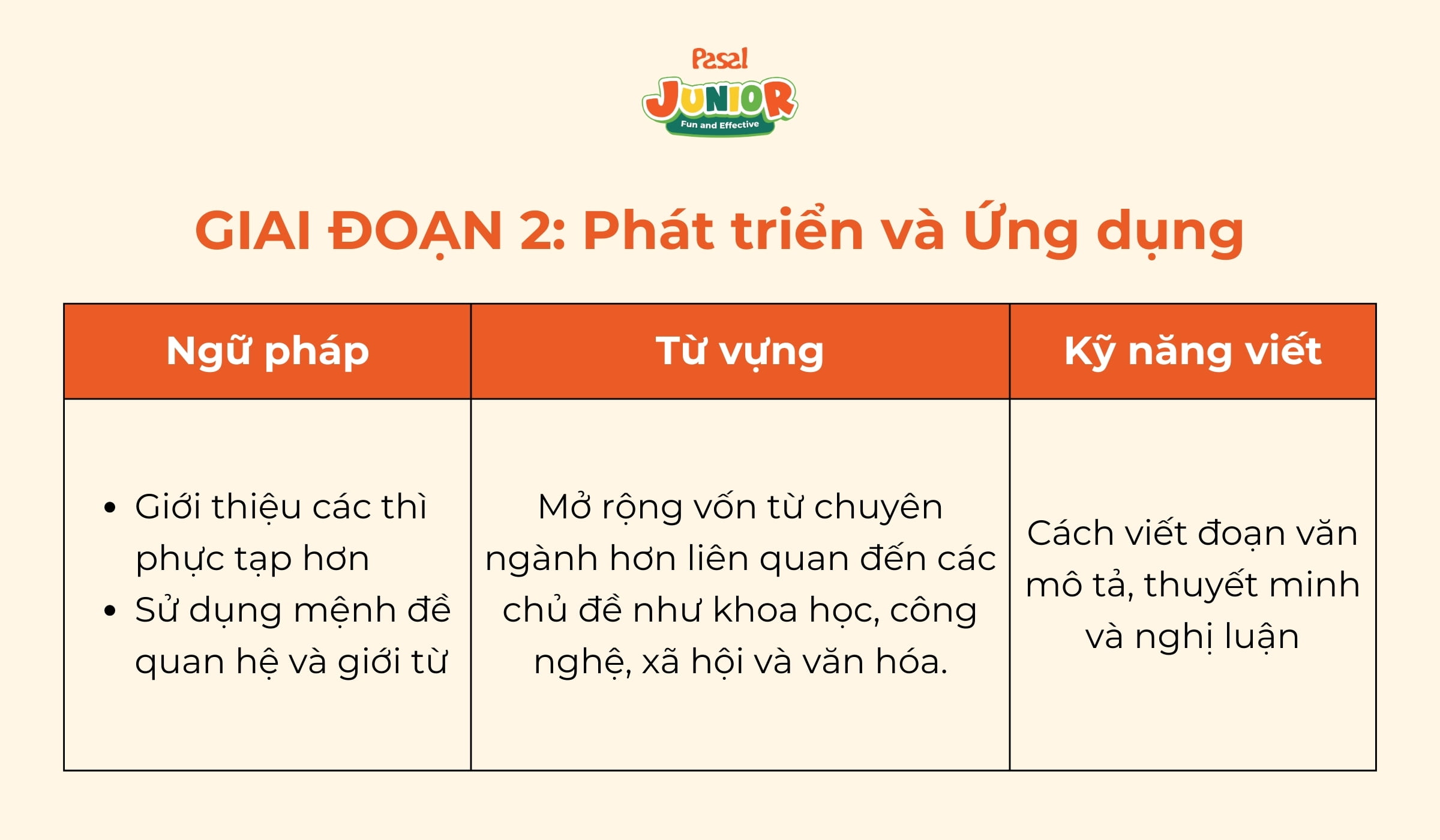 Giai đoạn này nhằm mục tiêu mở rộng vốn từ vựng và cấu trúc ngữ pháp, đồng thời cải thiện kỹ năng sử dụng tiếng Anh một cách linh hoạt và hiệu quả trong giao tiếp. Học sinh lớp 8 đến lớp 9 sẽ được học cách áp dụng tiếng Anh trong các tình huống thực tế phức tạp hơn, bao gồm cả trong học tập và giao tiếp hàng ngày.