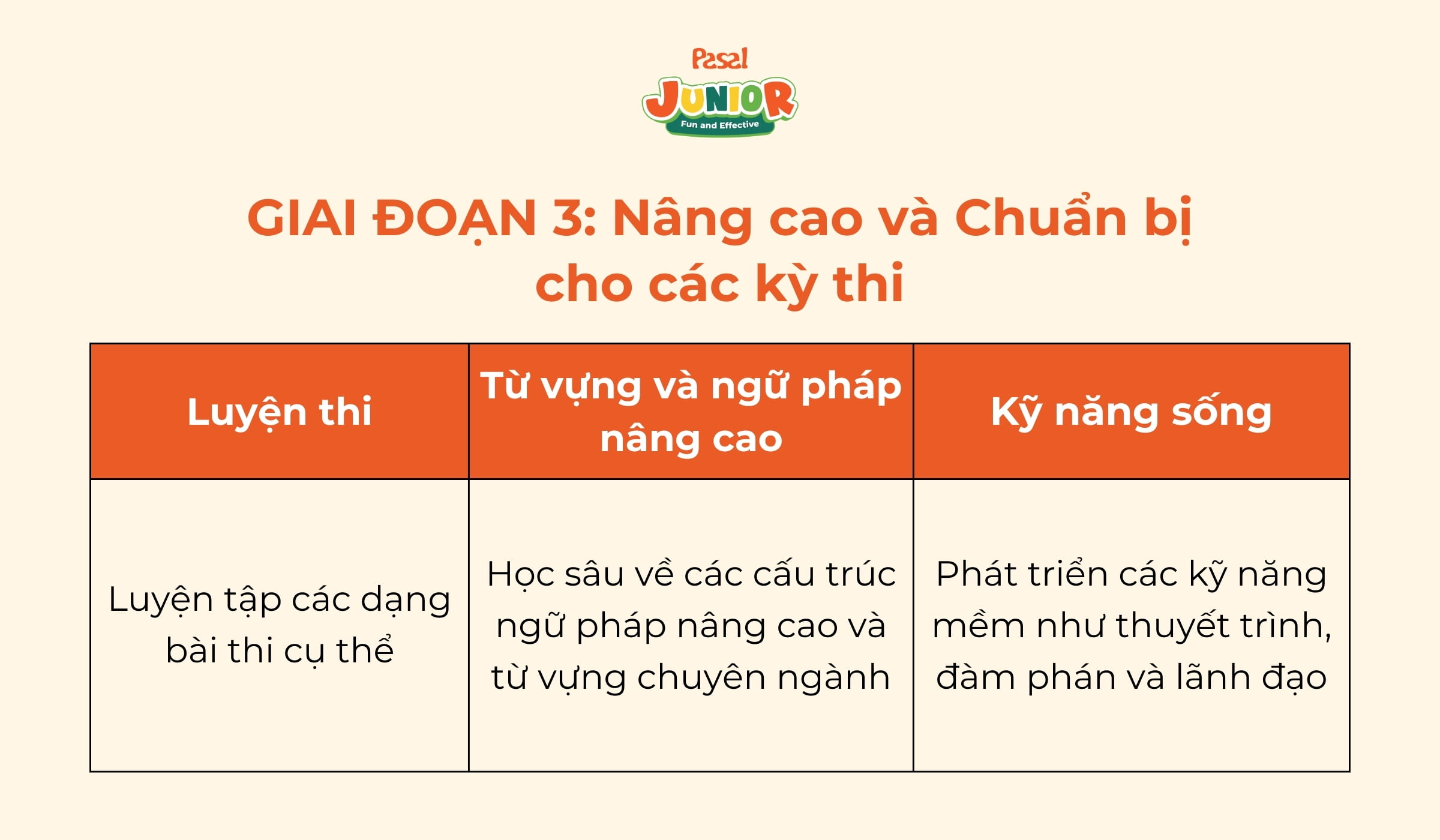 Giai đoạn cuối cùng nhằm chuẩn bị cho học sinh các kỳ thi quốc tế và cải thiện kỹ năng giao tiếp tiếng Anh ở mức độ cao. Mục tiêu là giúp học sinh thành thạo tiếng Anh không chỉ trong bối cảnh học thuật mà còn trong giao tiếp chuyên nghiệp và các hoạt động xã hội khác.